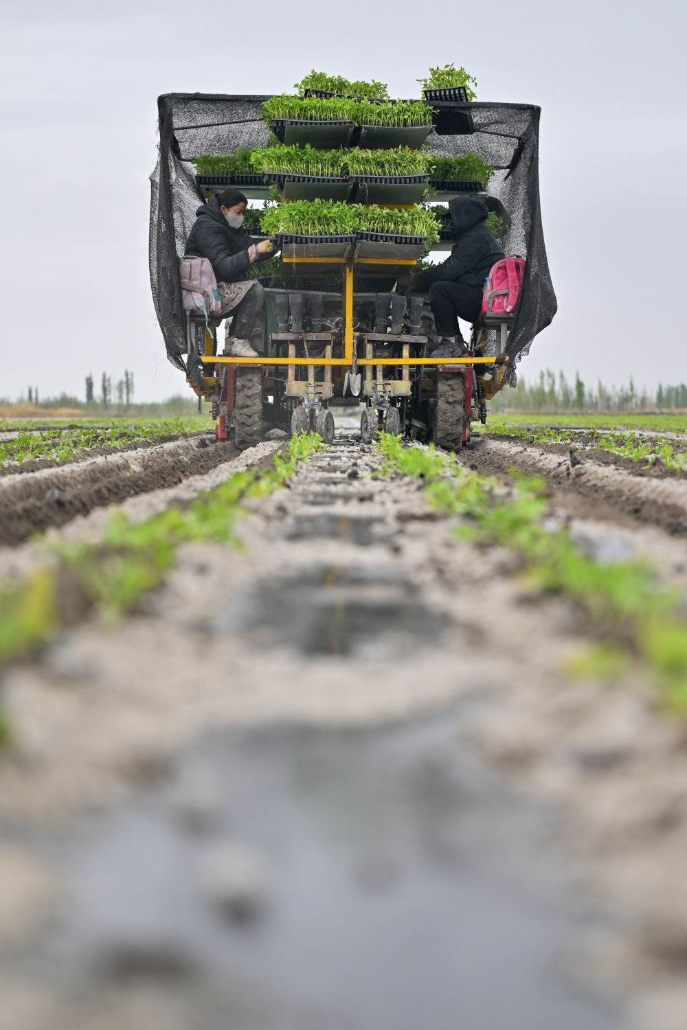 记者正在番茄移栽地里看到,由拖沓机牵引的从动移栽机,把苗盘放到响应的传送带上,夹苗安拆就能从动功课。一台移栽机一天功课面积能达到30亩地,大大提拔了效率。