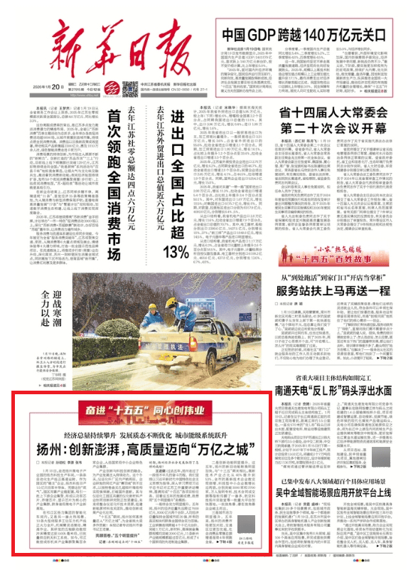 “十五五”期间,扬州若何高质量迈入“万亿之城”,为全省挑大梁多做贡献?1月20日,《新华日报》专访市委健,并正在头版刊发题为《扬州:立异磅礴,高质量迈向“万亿之城”》的文章。