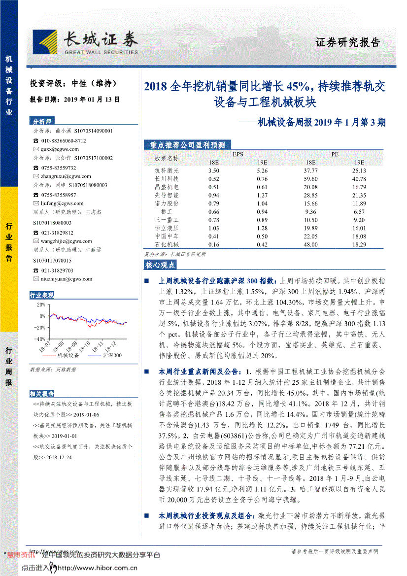 跑赢沪深300指数:上周市场持续回暖。【慧博投研资讯】此中创业板指上涨1。32%,上证综指上涨1。55%,沪深300上周涨幅达1。94%。(慧博投研资讯)沪深两市上周总成交量1。64万亿,环比上涨104。30%,市场买卖量大幅上升。申万一级子行业全数上涨,此中通信、电气设备、家用电器、电子行业涨幅超5%,机械设备行业涨幅达3。07%,排名第8/28,跑赢沪深300指数1。13个pct。机械设备细行业中,各子行业均录得涨幅,此中高铁、无人机、冷链物流块涨幅超5%。个股方面,浮图实业、英维克、兰石沉拆、伟隆股份、易成新能均涨幅跨越20%。本周行业沉点旧事及通知布告:1。按照中国工程机械工业协会挖掘机械分会行业统计数据,2018年1-12月纳入统计的25家从机制制企业,共计发卖各类挖掘机械产物20。34万台,同比增加45。0%。此中,国内市场销量(统计范围不含港澳台)18。42万台,同比增加41。1%。2018年12月,共计发卖各类挖掘机械产物1。6万台,同比增加14。4%。国内市场销量(统计范围不含港澳台)1。43万台,同比增加12。2%。出口销量1749台,同比增加37。5%。2。白云电器(603861)通知布告称,公司已确定为广州市轨道交通新建线供电系统设备及运维办事采购项目标中标单元,中标金额为77。21亿元。通知布告及广州地铁网坐的投标环境显示,项目录要包罗设备供货、供货陪伴办事以及部门线的分析运维办事等,涉及广州地铁三号线东延、五号线亿元,净利润1。11亿元。3。哈工智能拟以自有资金人平易近币20,000万元出资设立全资子公司海宁我耀。本周机械行业投资概念及组合:激光行业下逛市场潜力不竭,激光器进口替代历程逐年加速;基建边际改善加强,持续关心工程机械行业;半导体景气周期延续,国产设备送来汗青成长机缘;锂电行业优胜劣汰加快,高端产能需求仍然兴旺;国内页岩气开辟提速,国产压裂设备需求迸发。智能物流市场空间近千亿,系统集成商送来黄金成长期。轨交设备进入采购高峰期,投资加快鞭策财产链苏醒。关心国产激光器龙头锐科激光;工程机械龙头柳工、徐工机械、三一沉工及焦点零部件供应商恒立液压;半导体测试设备龙头长川科技、半导体焦点设备龙头北方华创及晶体发展设备领先者晶盛机电;国内锂电设备龙头先导智能;国产压裂设备龙头石化机械;打通智能物流配备全财产链的行业龙头诺力股份;轨交设备绝对龙头中国中车。